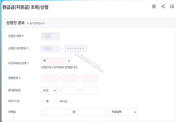 1. 신청하기 클릭한 후 아래와 같이 이름. 주민번호. 관계. 연락처를 기입합니다