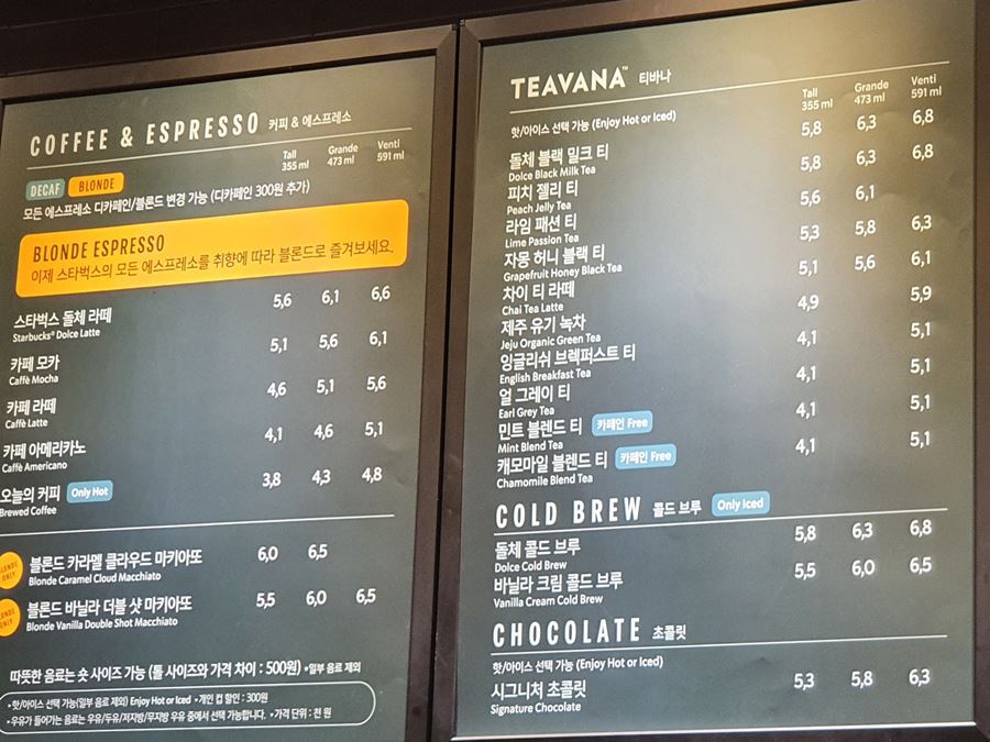 | 스타벅스 돌체라떼 | 5900 | 6400 | 6900 |