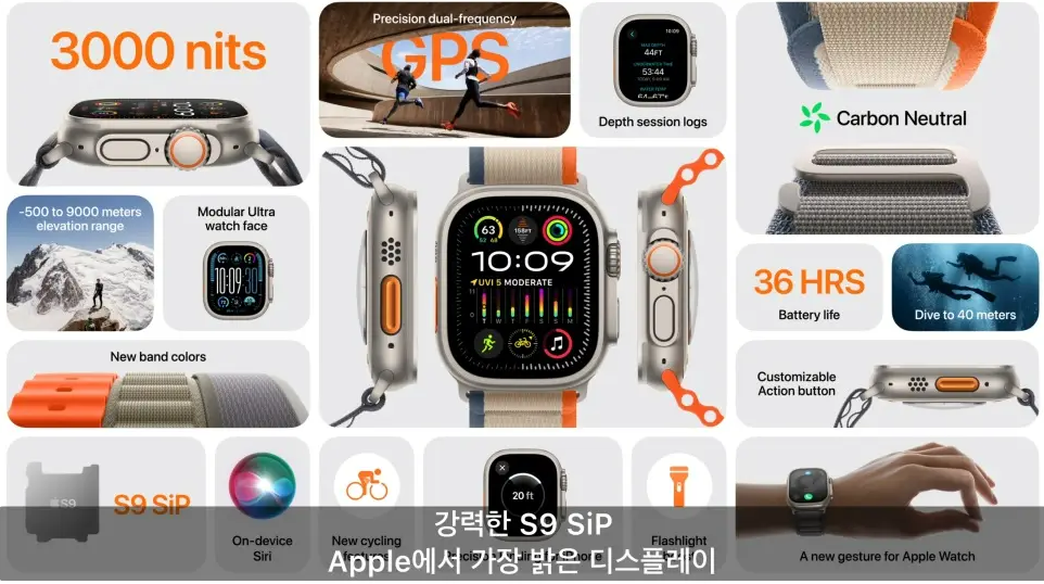 ●애플 워치 울트라 2는 애플워치 9처럼 새로운 S9 칩셋을 사용하여 더블탭 제스처 새로운 기능은 익스트림을 위해 나온 울트라 2가 더욱 많은 활용도가 높을 것 같습니다.