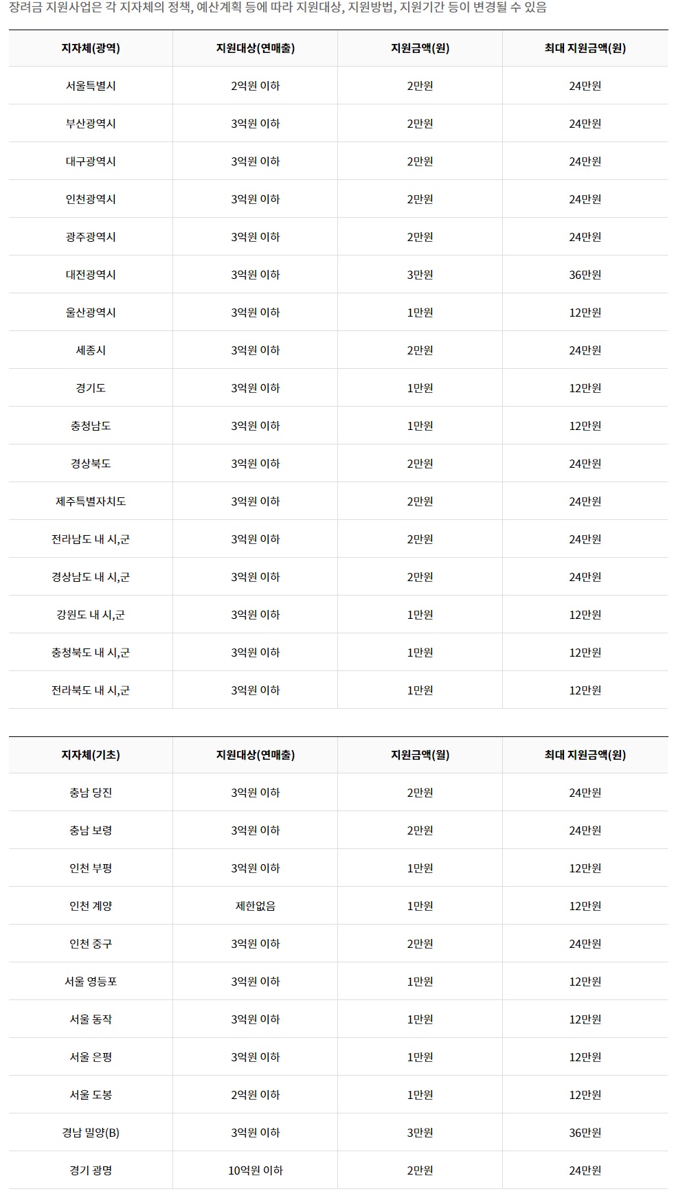 ○지자체별 지원대상과 지원금액