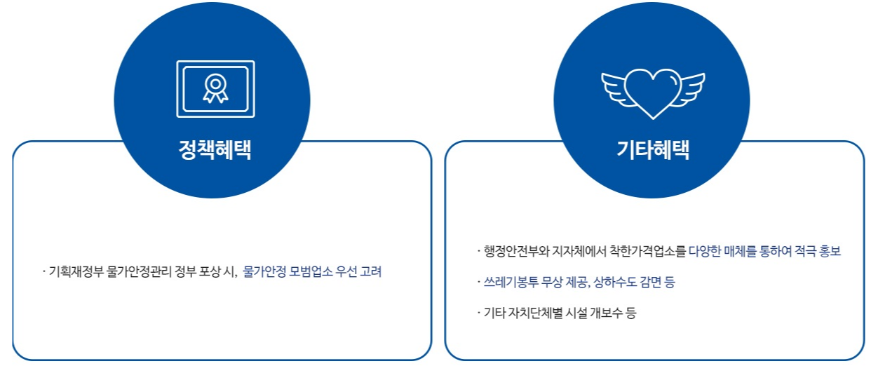 깨끗하고 위생적 인환경, 친절한서 비를 통해 소비자들이 다시 찾고 싶어 하는 업소입니다. 저렴한 가격으로 믿을 수 있는 재료를 사용하고 특별한서 비를 제공하는 업소는 아래 평가표에 기준에 통과되면 착한 가격지정업소로 지정받을 수 있습니다.