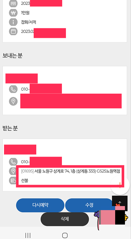 4. 소포를 받으실 분 이름과 연락처를 기입하시고 소포를 받으실 GS25 편의점 위치를 정하시고 택배예약하시면 끝입니다. 아주 쉽습니다.
