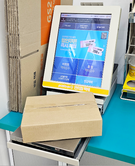 1. 포장한 택배를 가까운 GS25 편의점으로 가서 무인 택배접포스 기를 찾습니다.