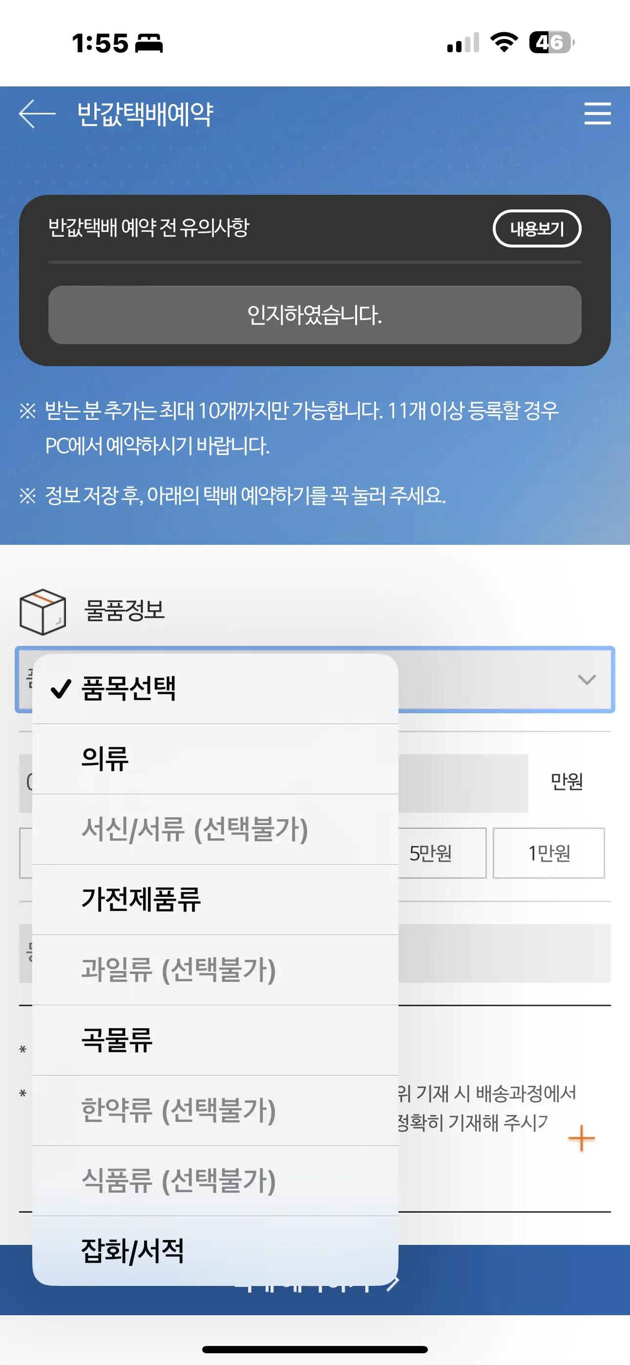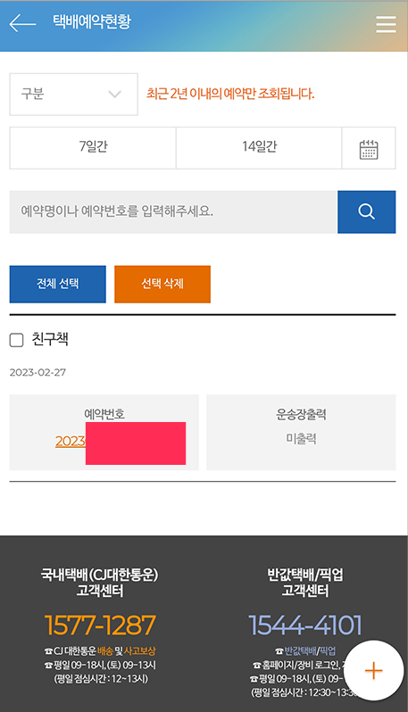 2. 회원에 등록합니다. 상단에 있는 반갑택배예약클릭합니다. 다음화면에 접수불가항목이 저렇게 나옵니다