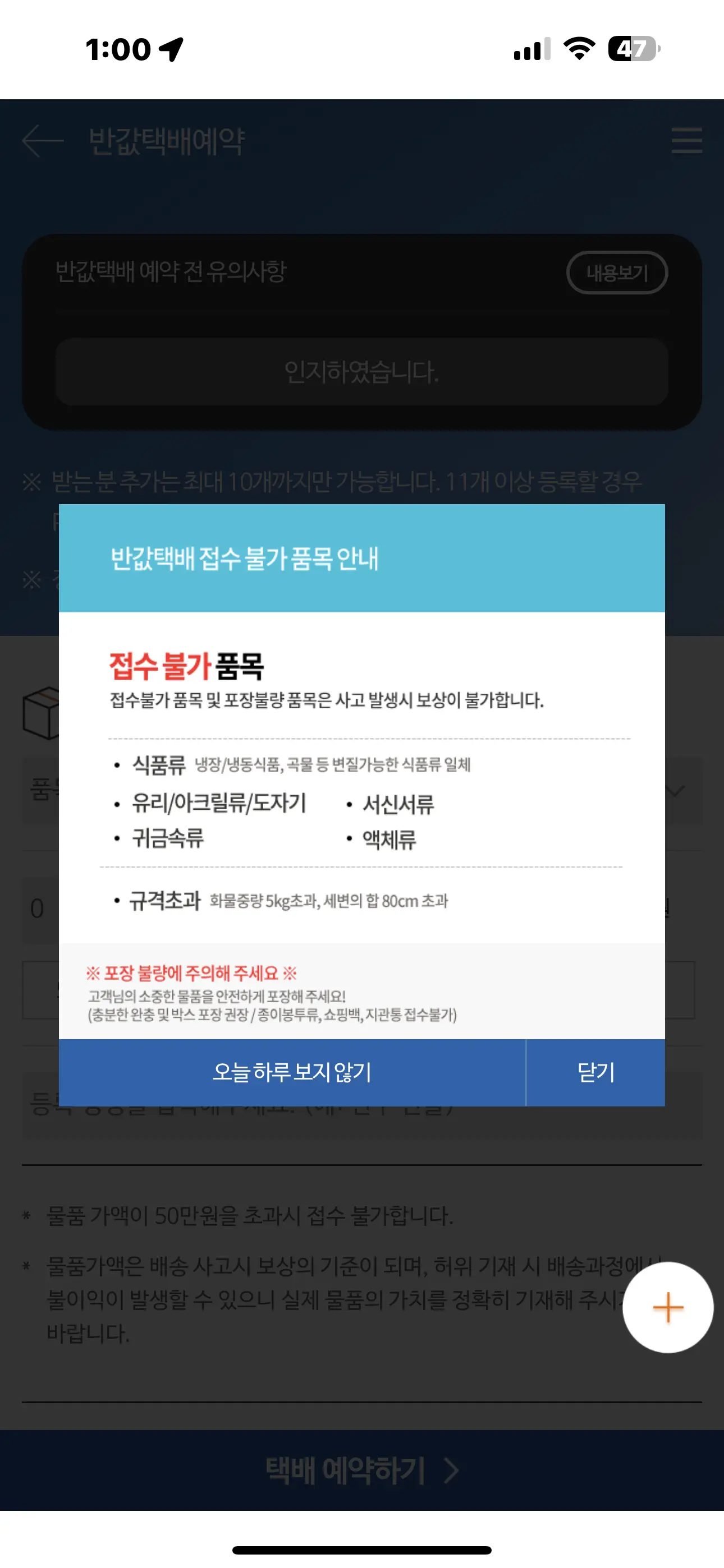 접수불가항목은 식품류, 유리, 아크릴, 도자기, 서신서류, 귀금속류, 액체류는 보낼 수 없습니다.